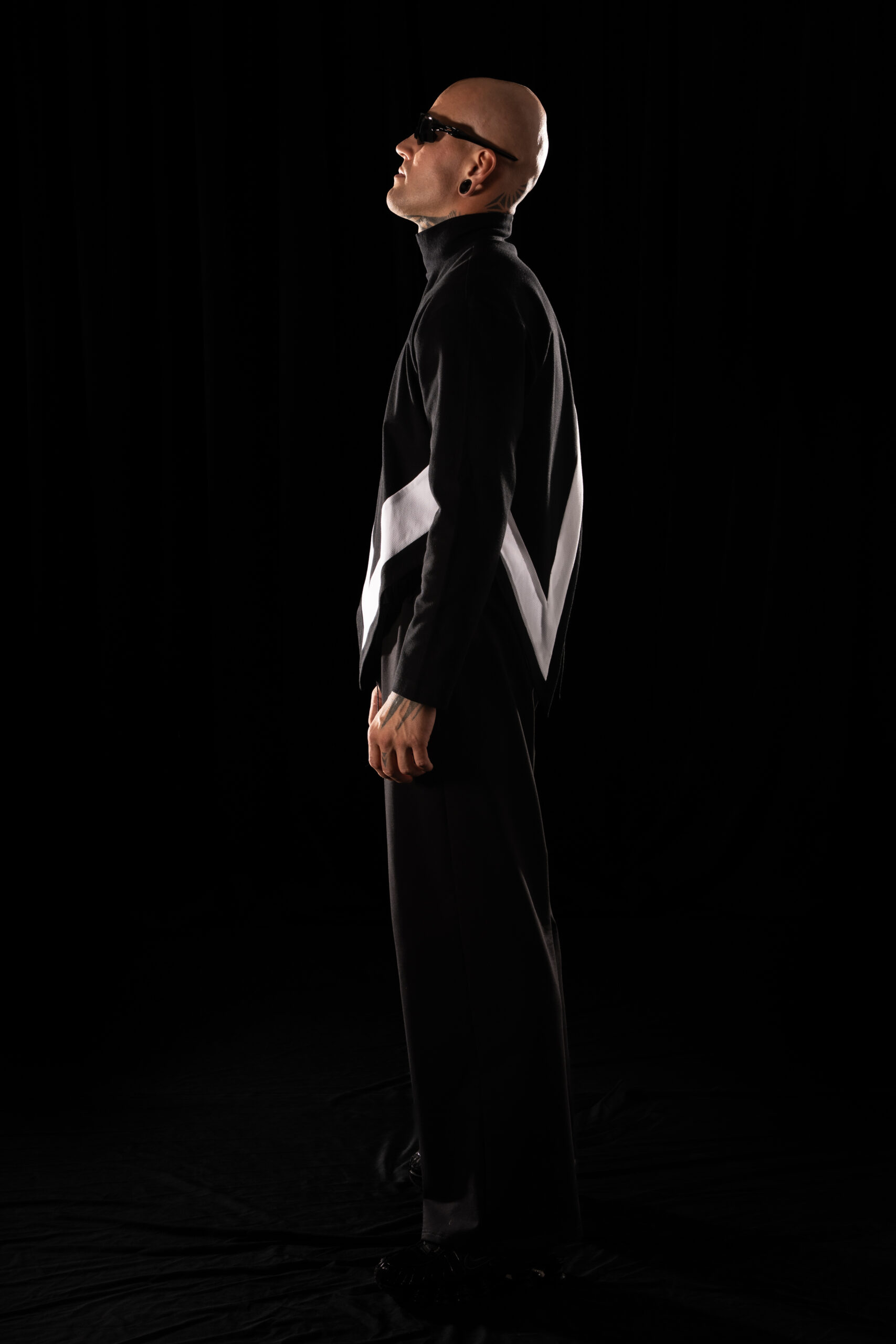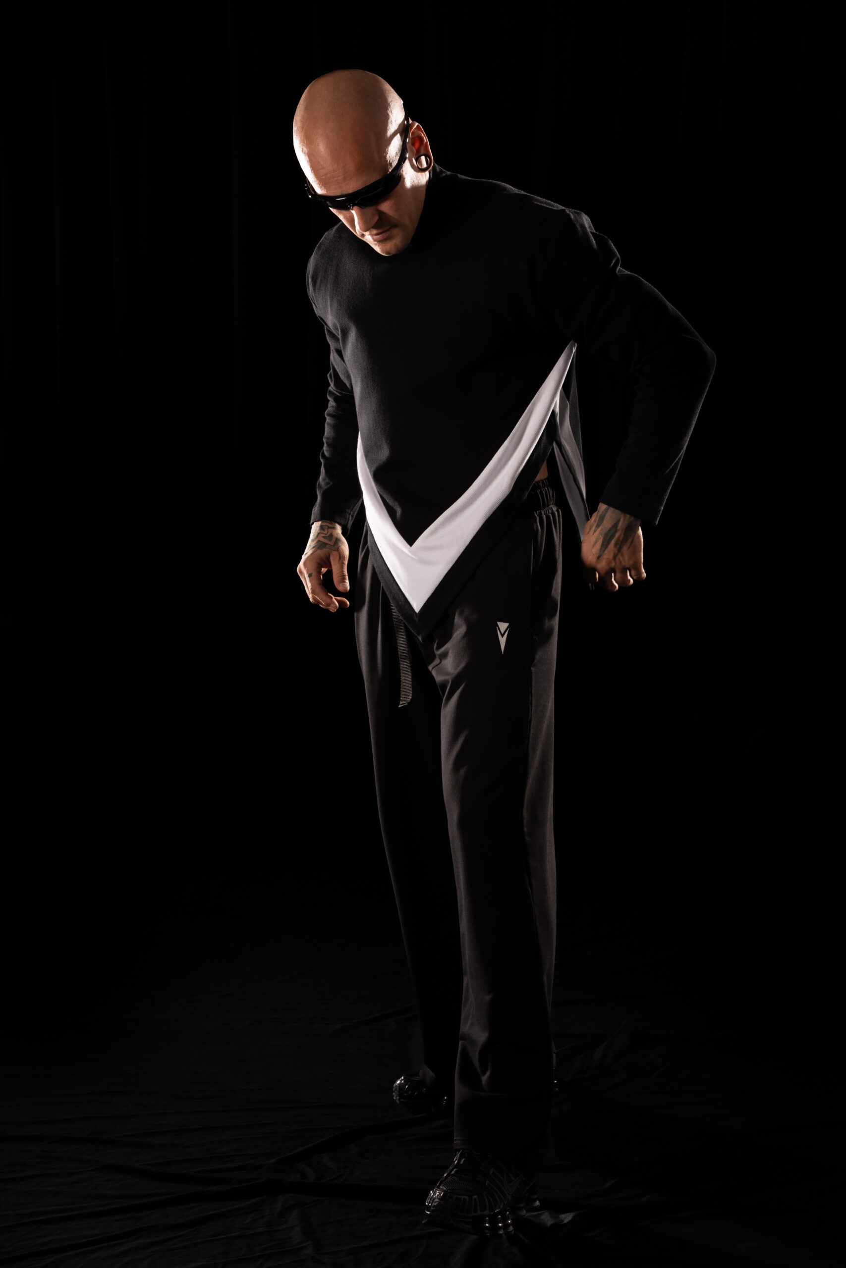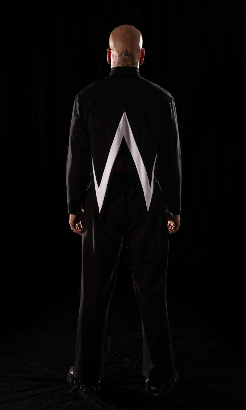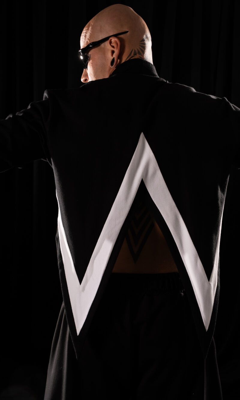 collar fits perfectly to the neck, giving it a modern, technical edge. The front hem ends in a sharp point, with