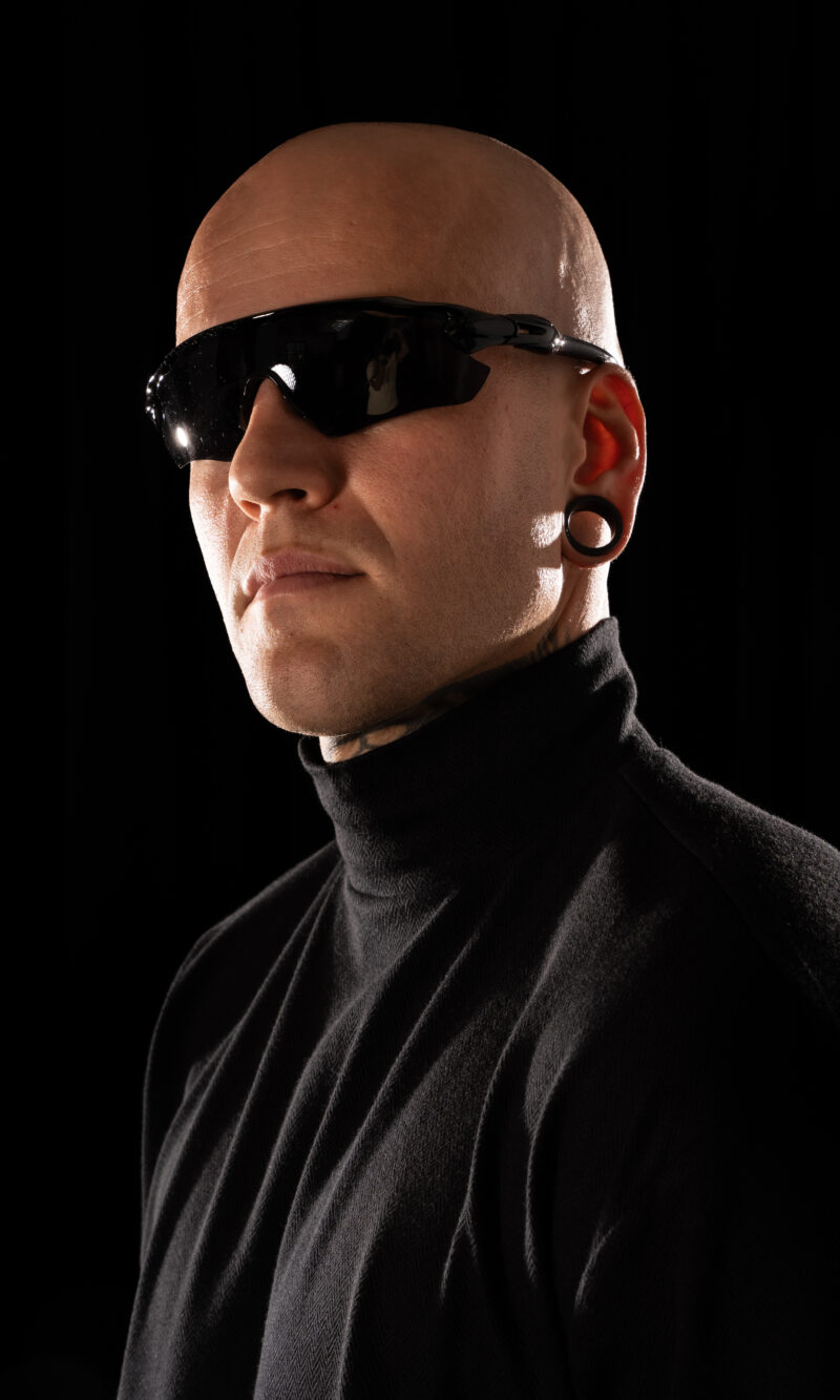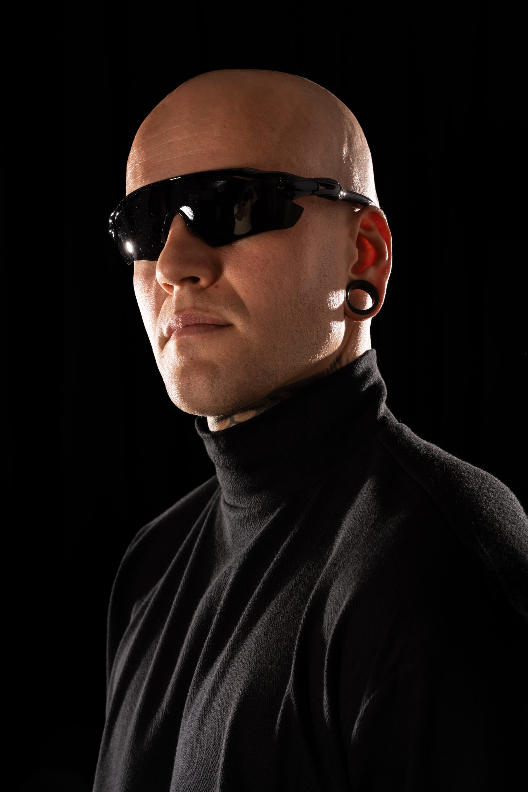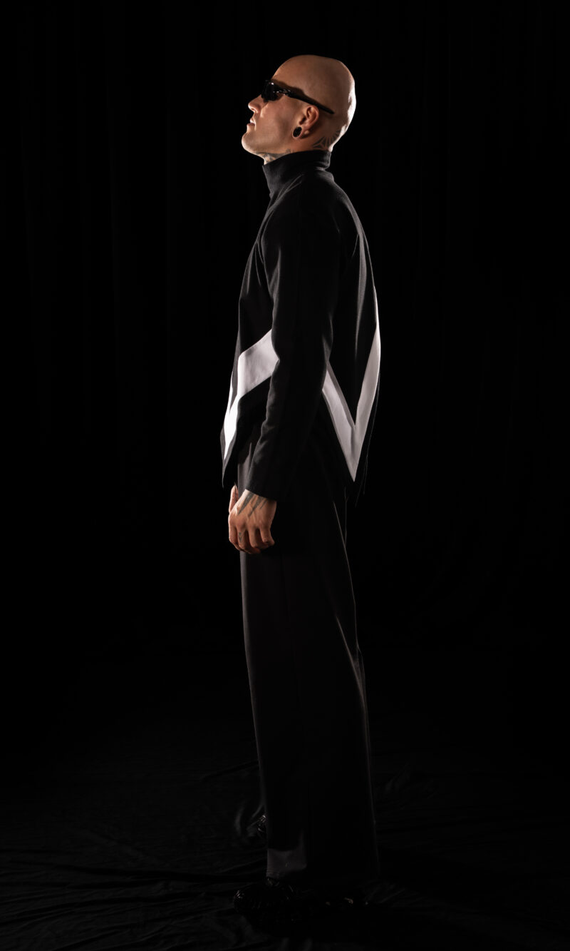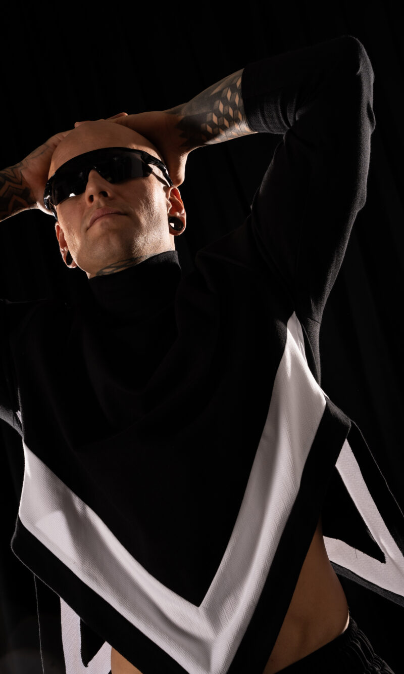 collar fits perfectly to the neck, giving it a modern, technical edge. The front hem ends in a sharp point, with