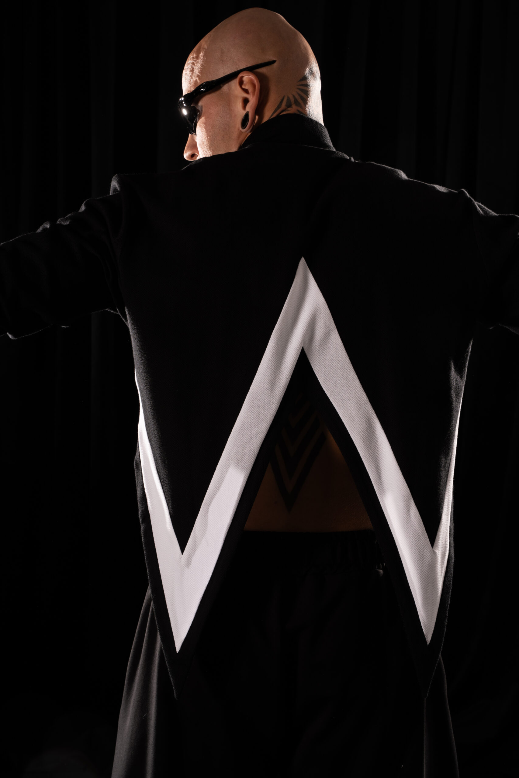 the cut line extending to the back, where two butterfly wing-like slits are placed. These are finished with a