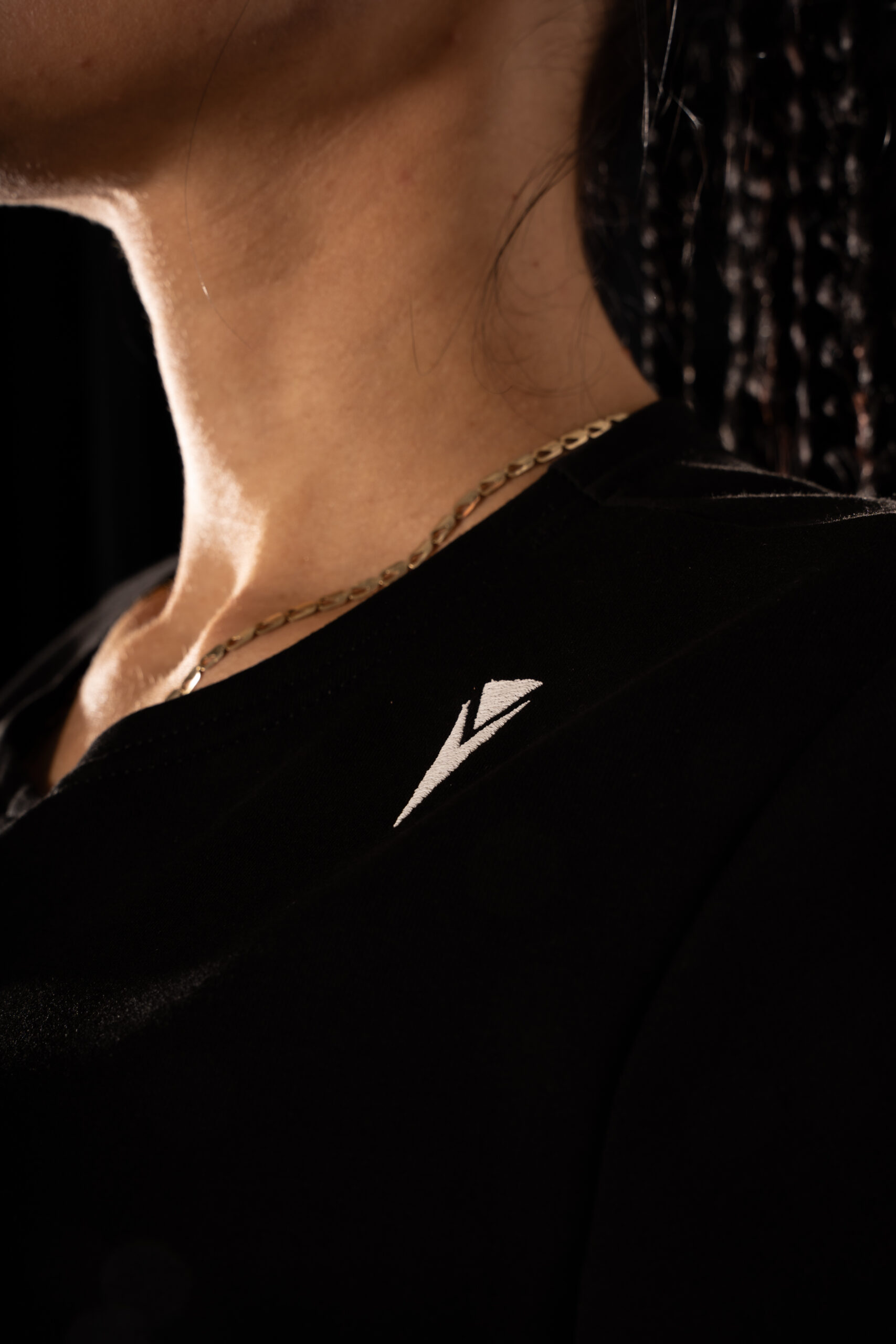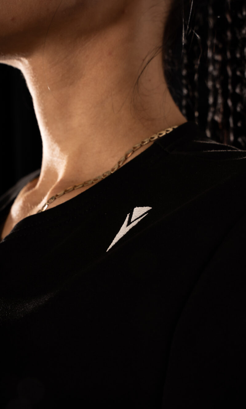 front and back, creating a distinctive silhouette, while two small embroidered logos near the collarbones add