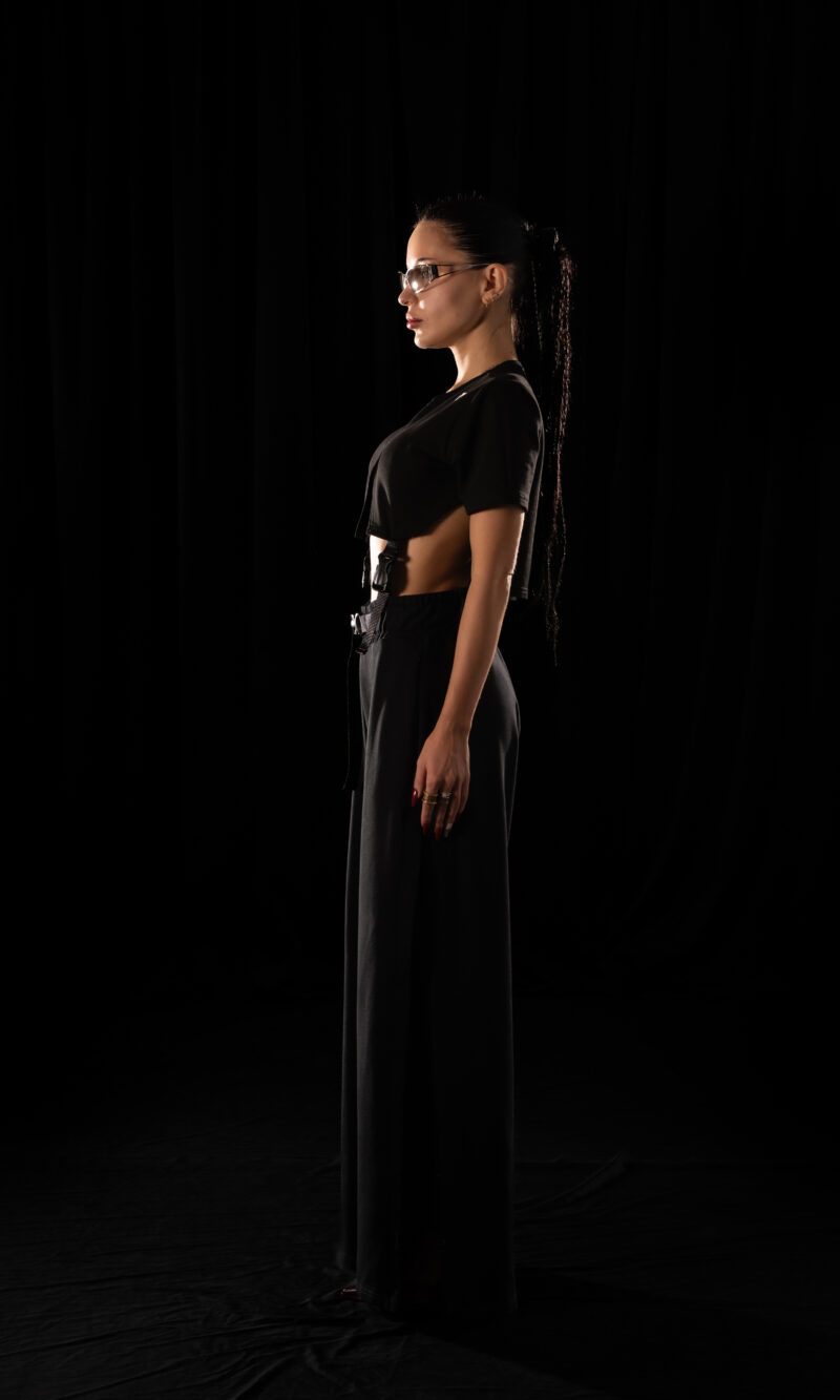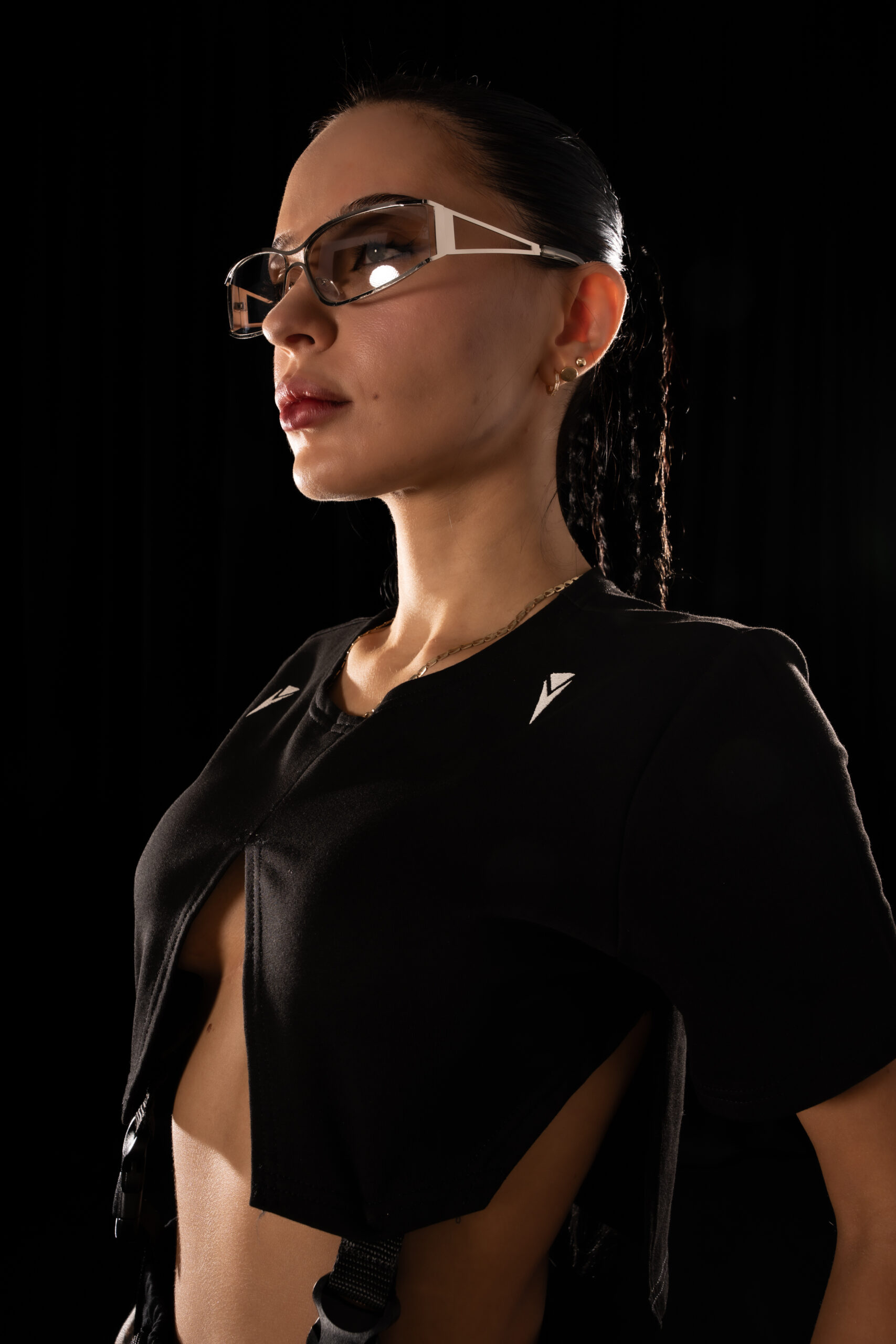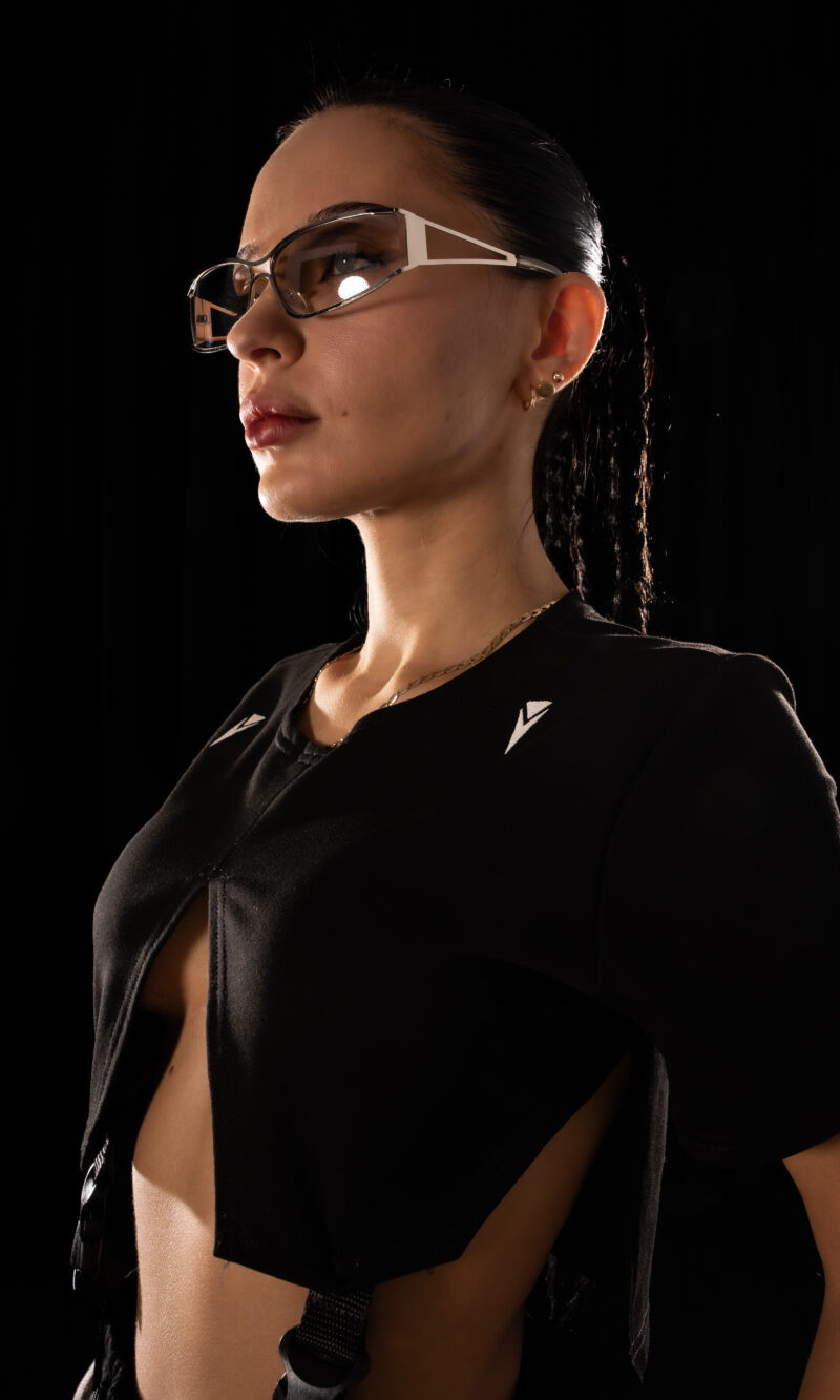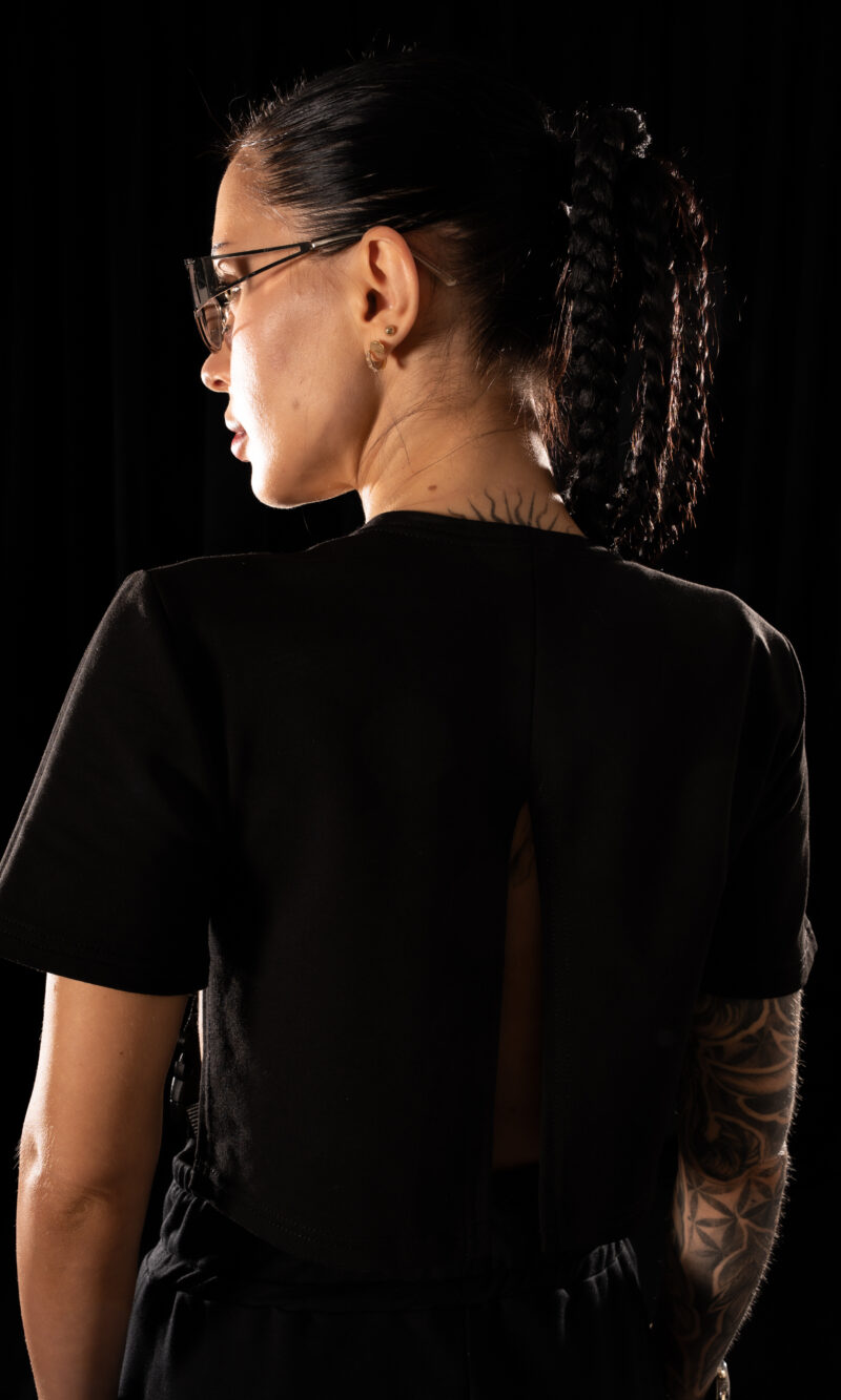 A Crystal Evo T-shirt that breaks the rules of garment construction. Vertical slits run through the center