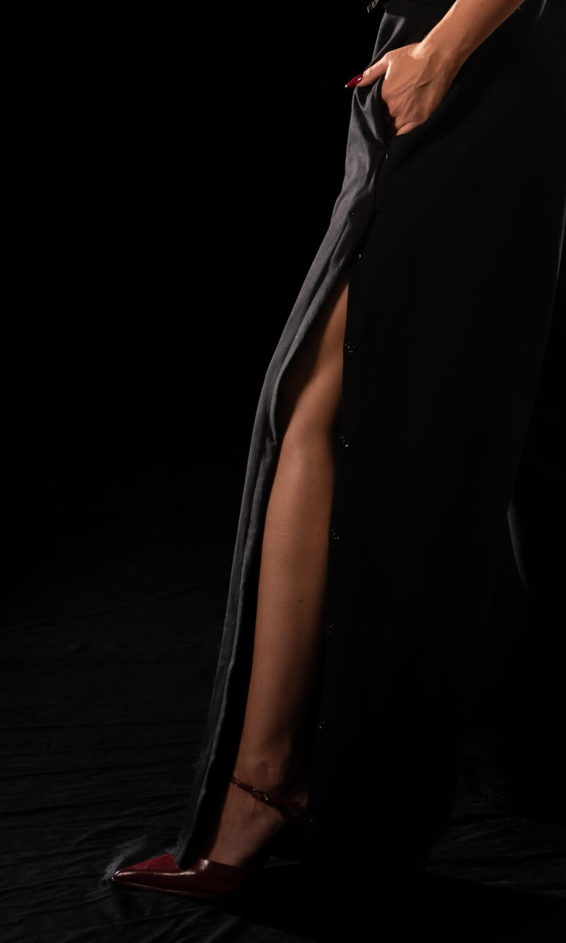 a subtle brand signature. The front slits are equipped with adjustable straps fastened by snap buttons – one