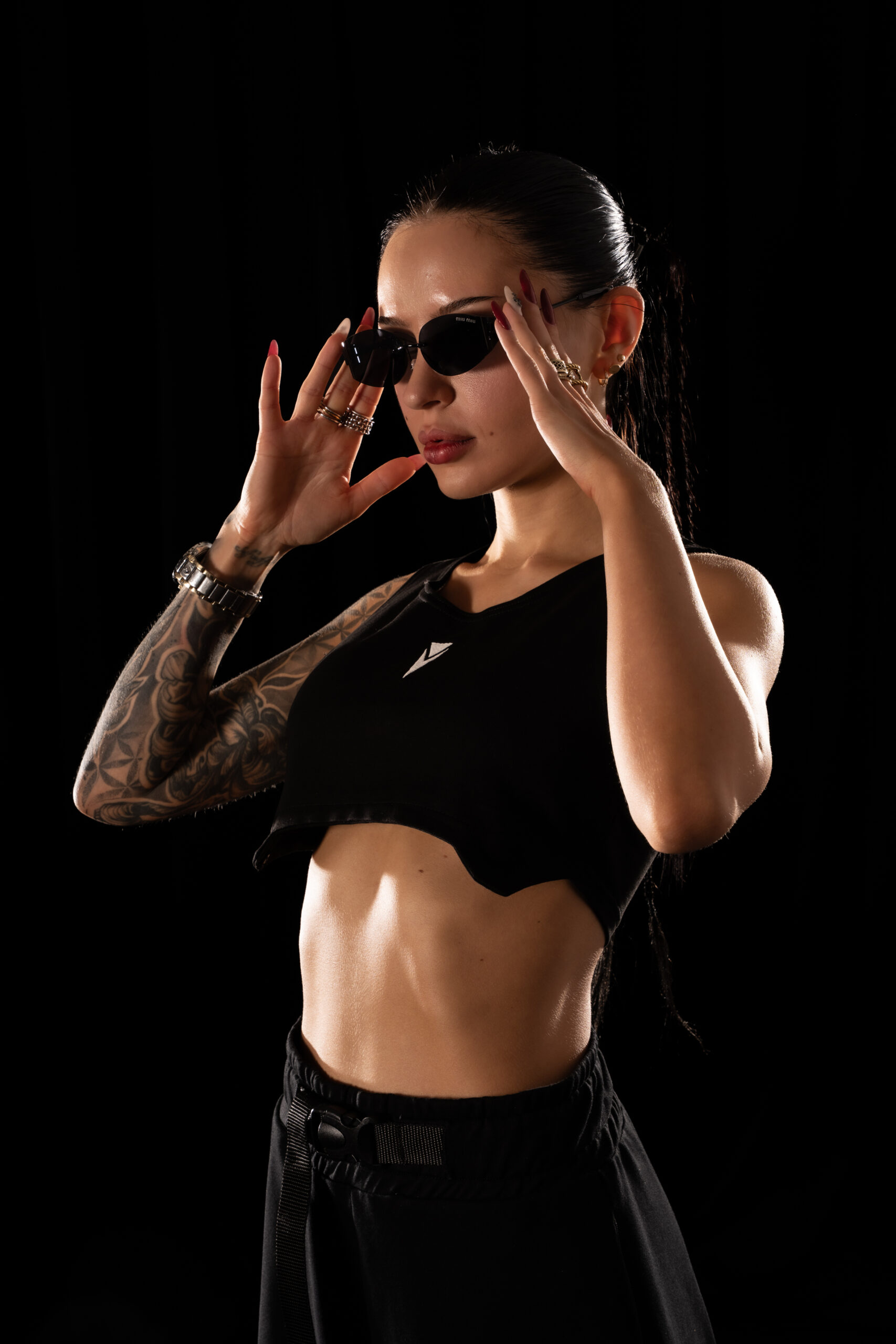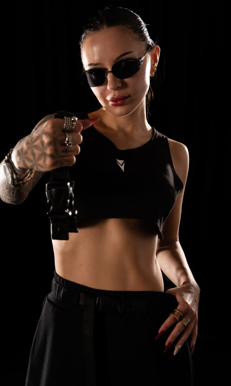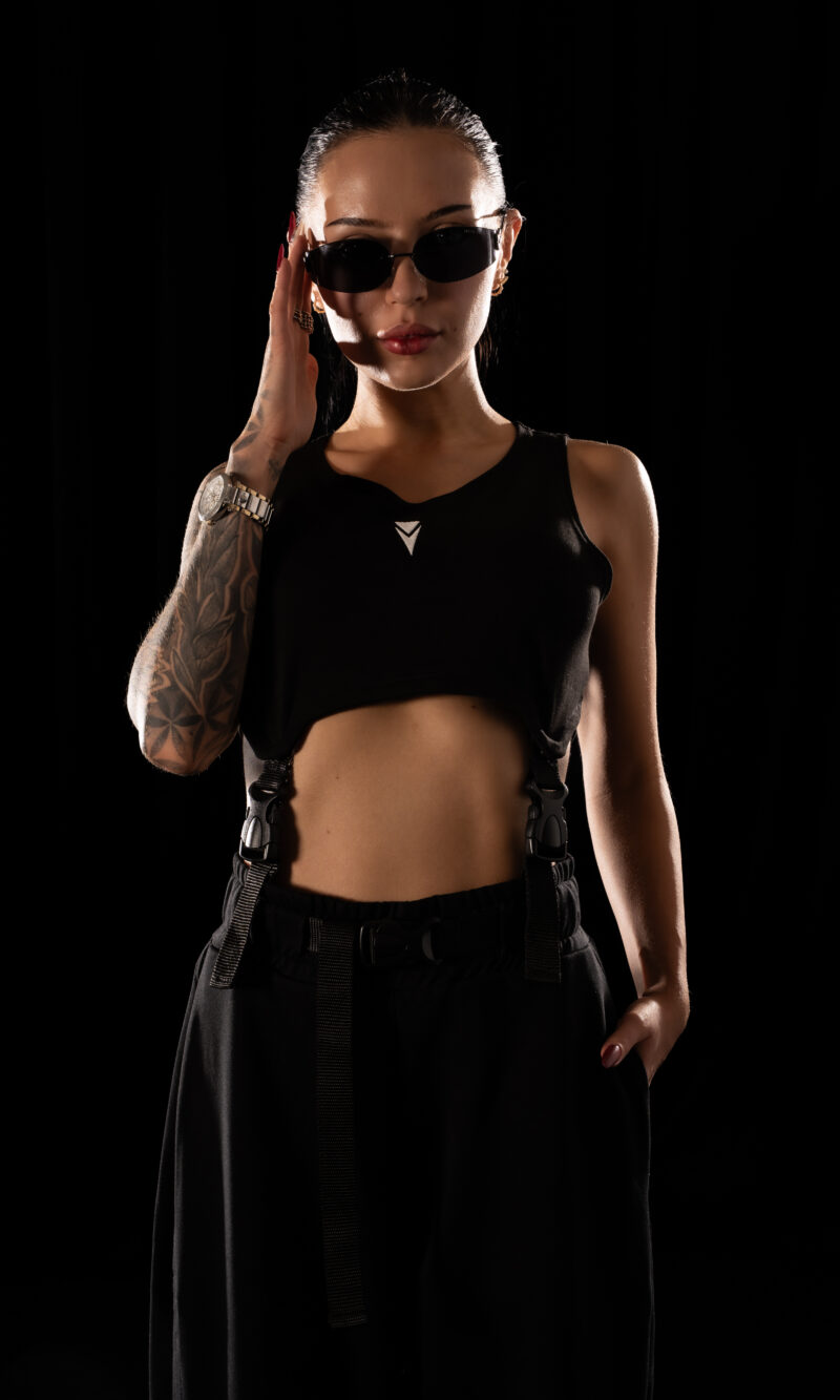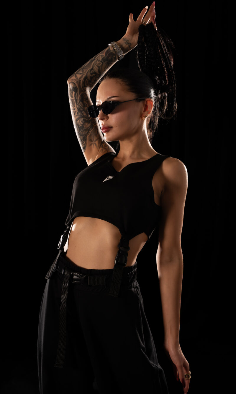 A Crystal Evo top where aesthetics meet functionality. The trapezoid-shaped front hem creates a