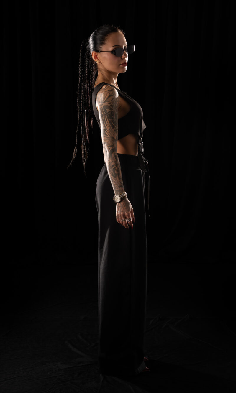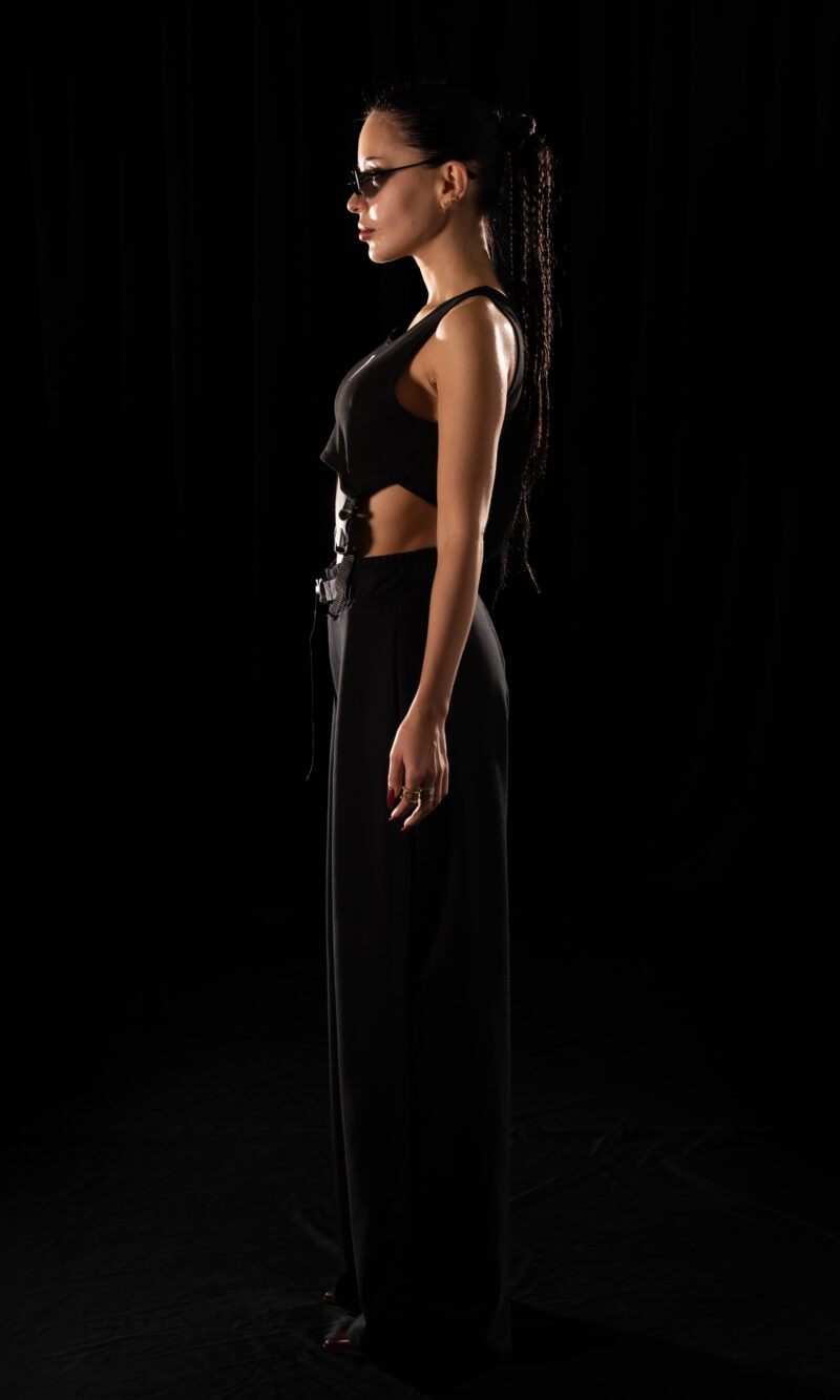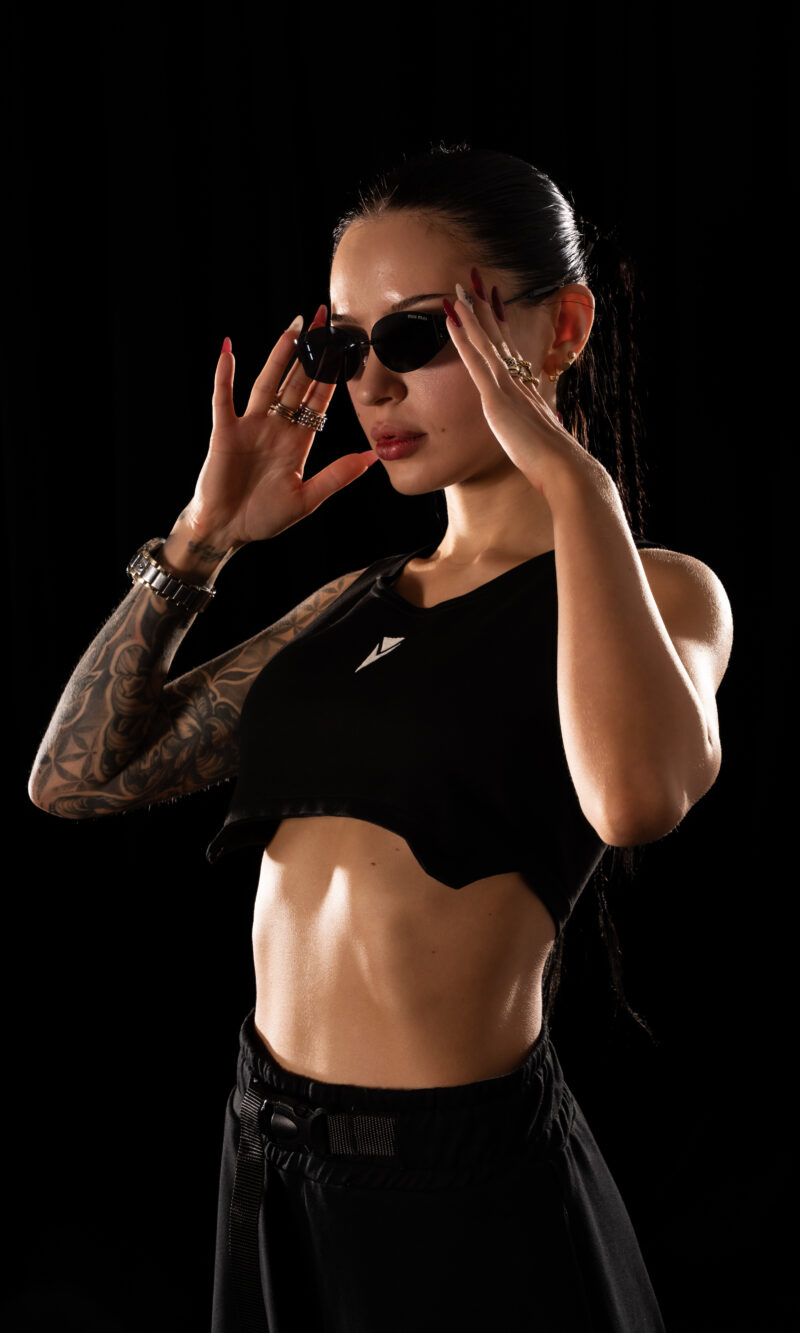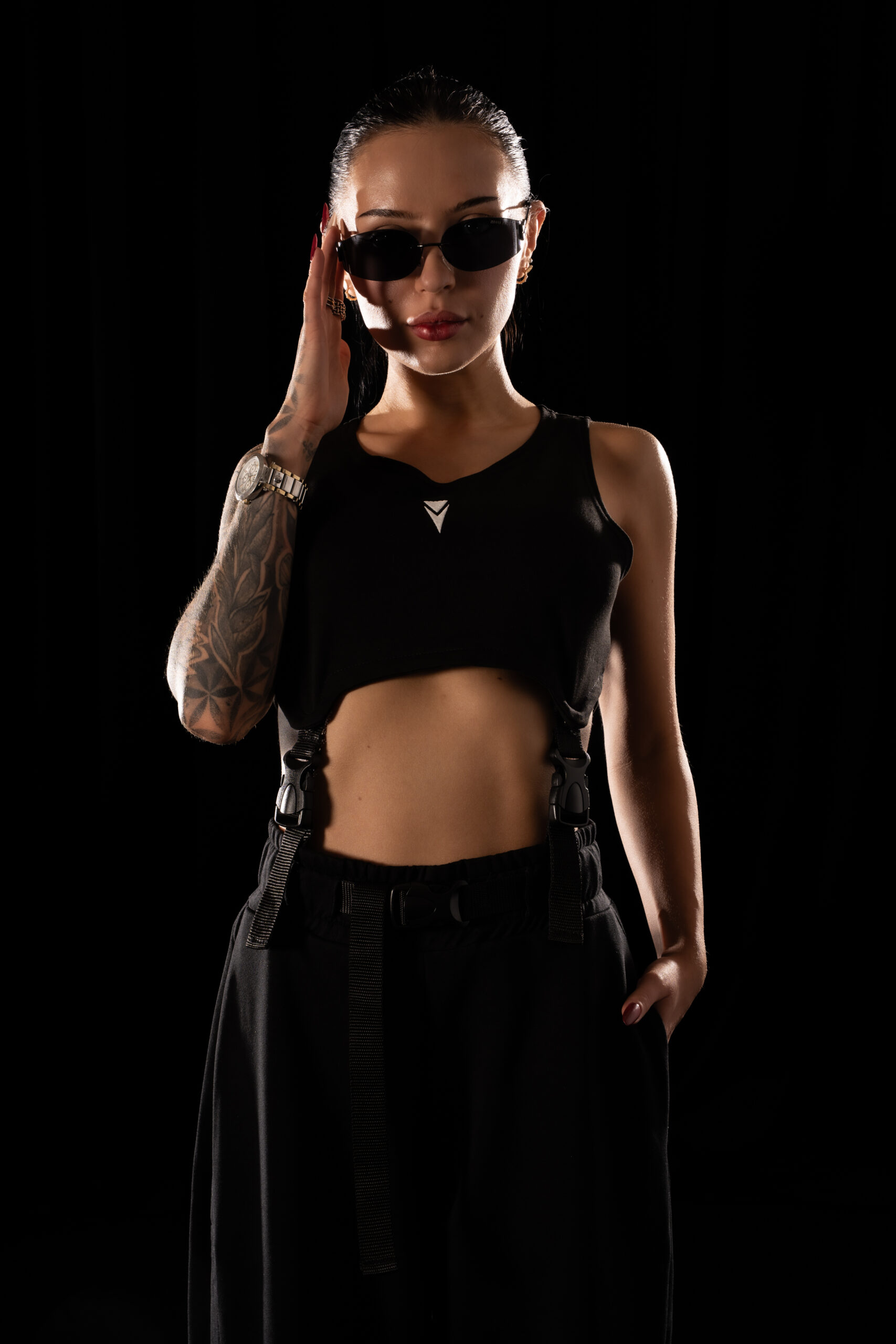 A Crystal Evo top where aesthetics meet functionality. The trapezoid-shaped front hem creates a