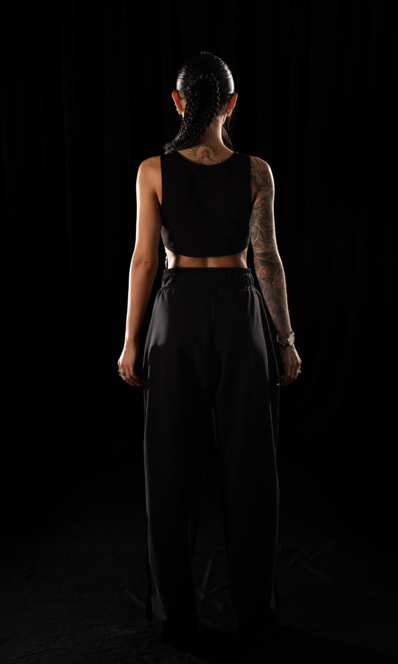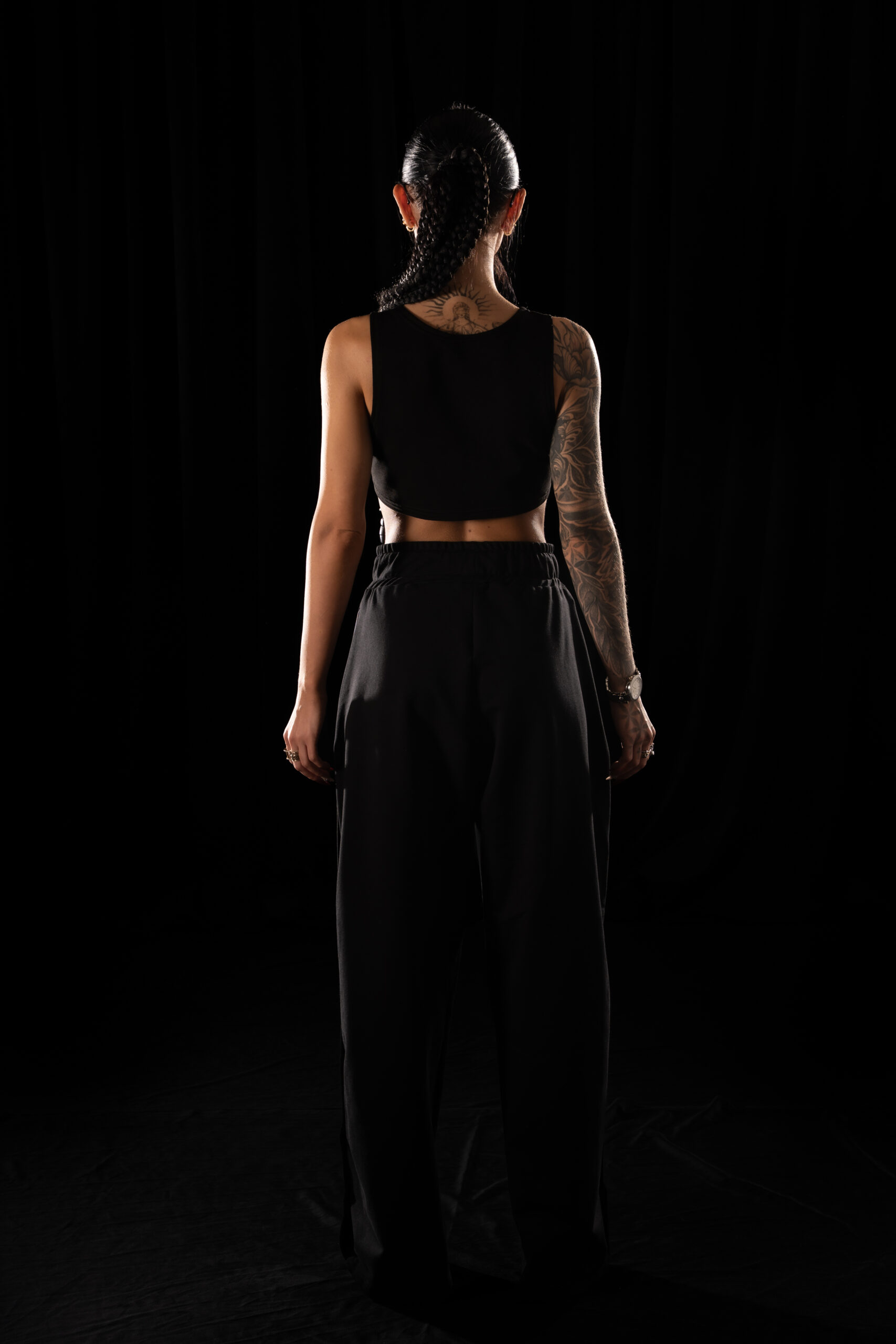 Long, oversized Crystal Evo trousers with a wide-leg cut, featuring two concealed zip pockets in the