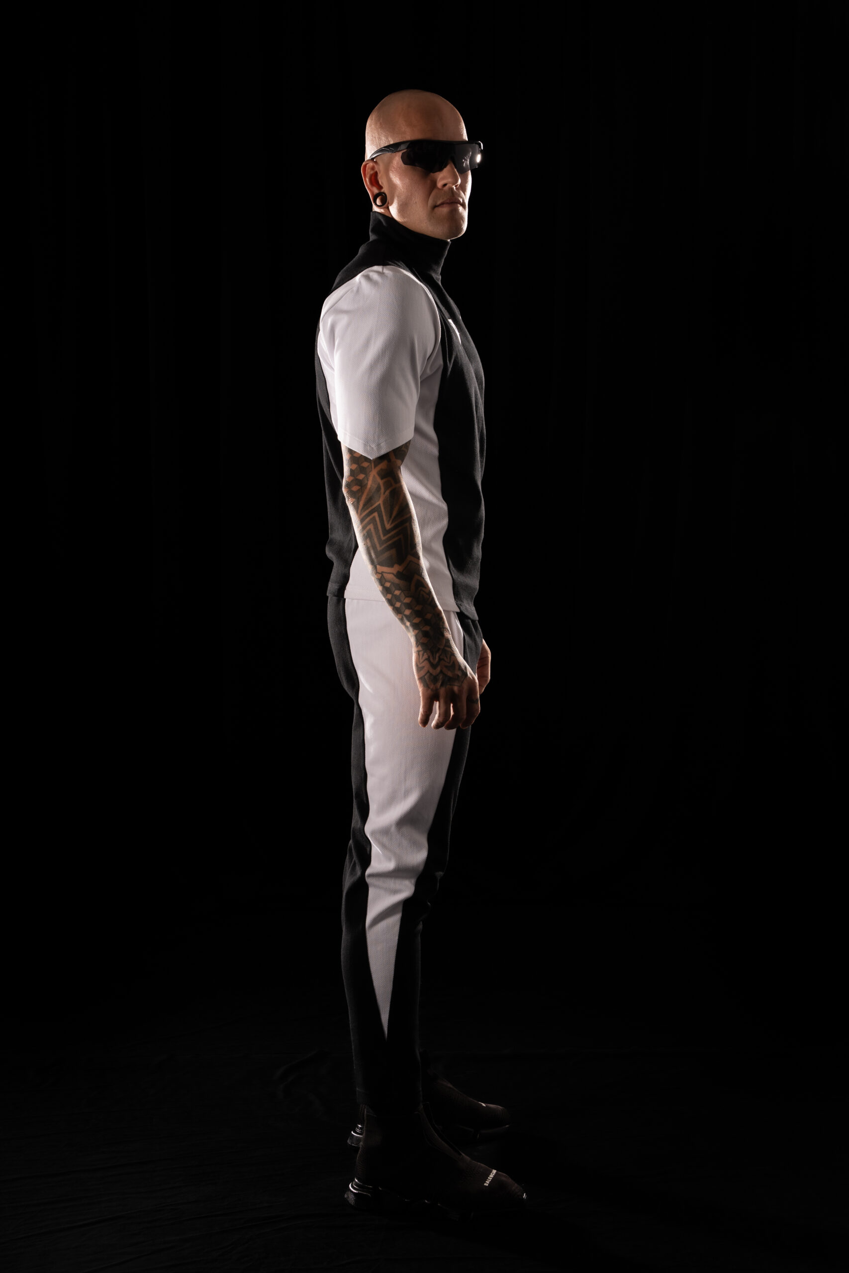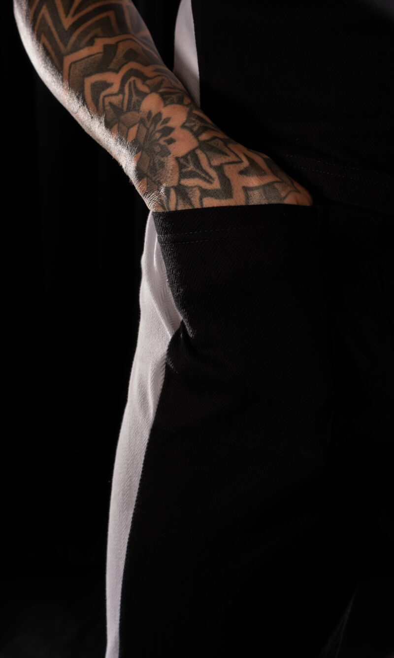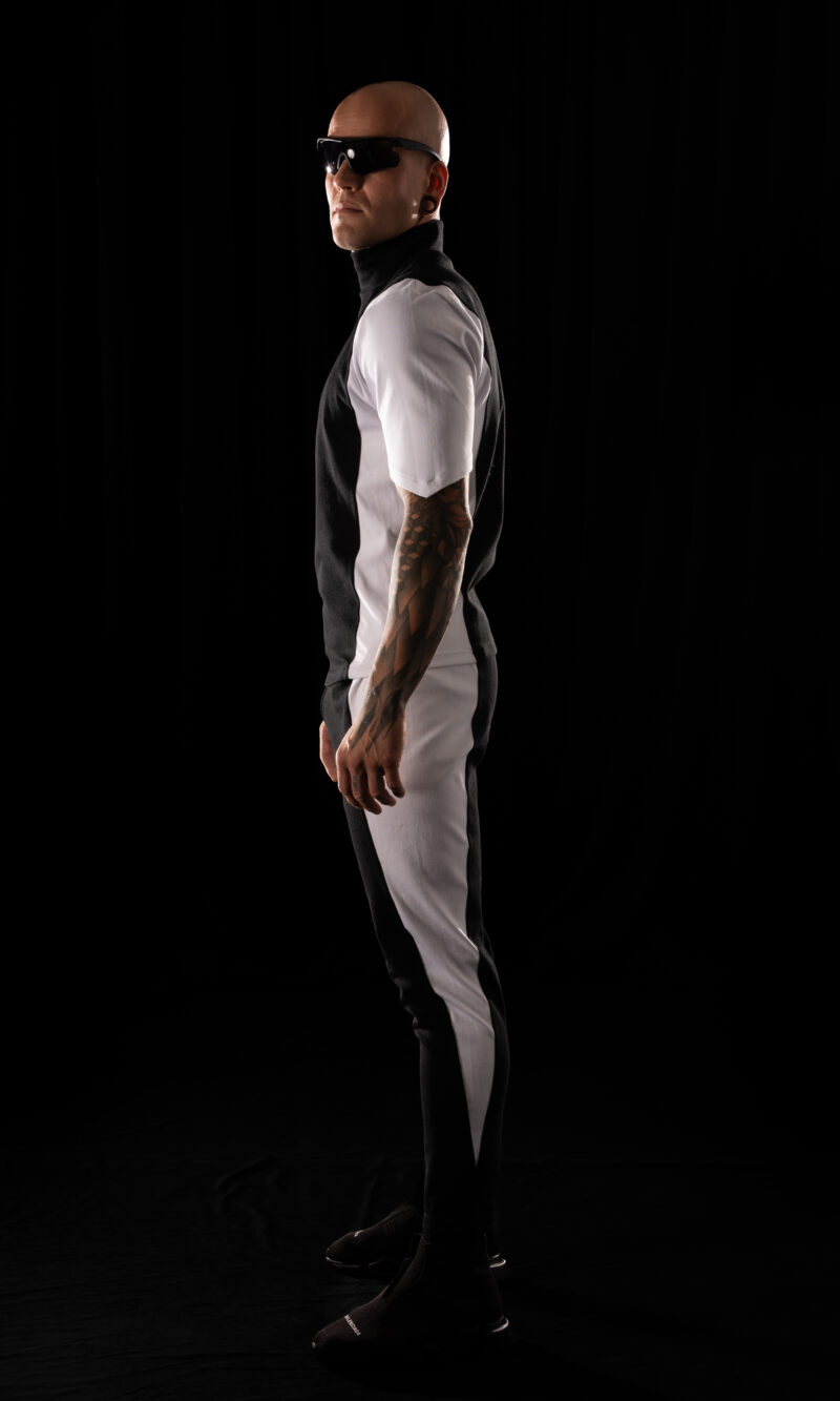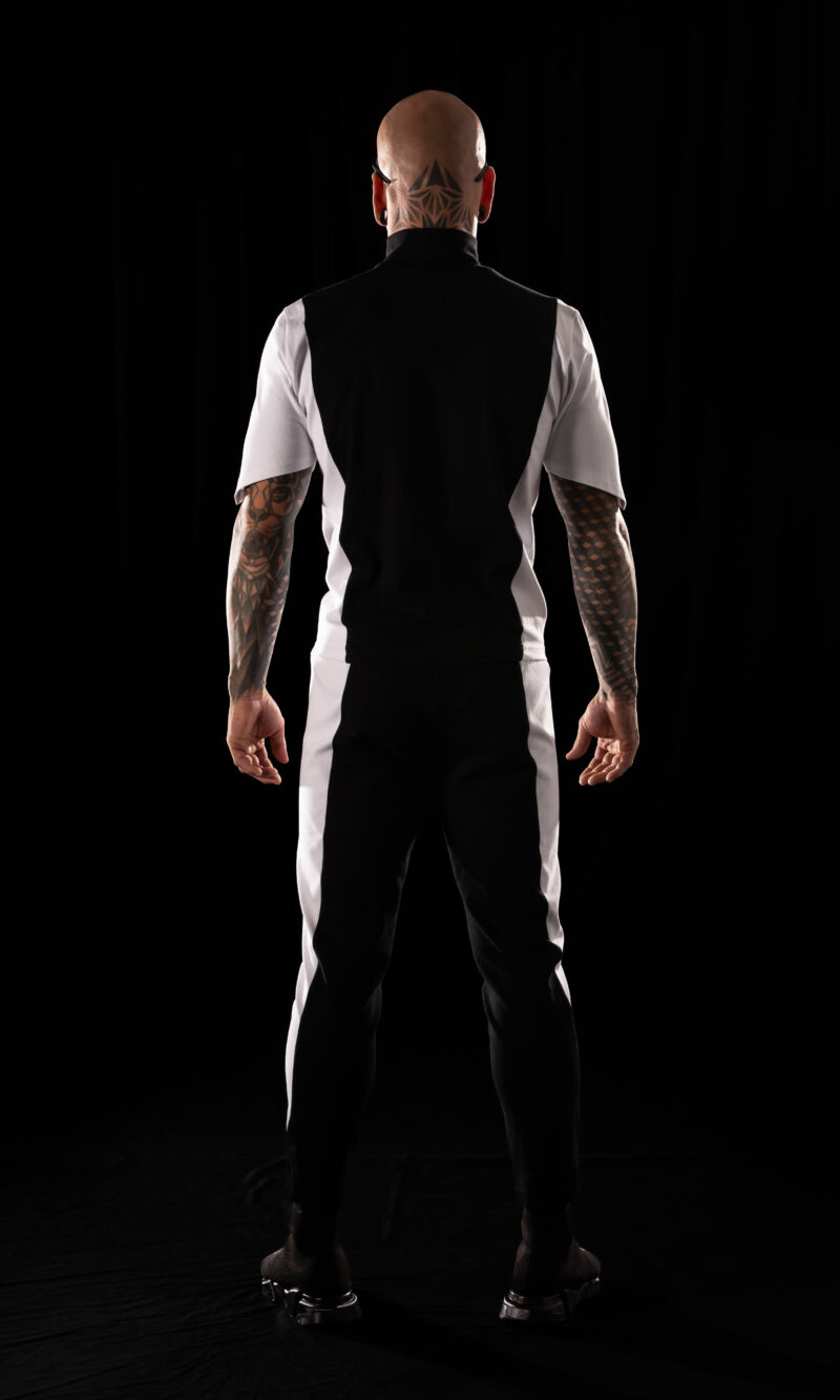 Crystal Evo trousers in a matching color-block construction – black central panels and white side panels,