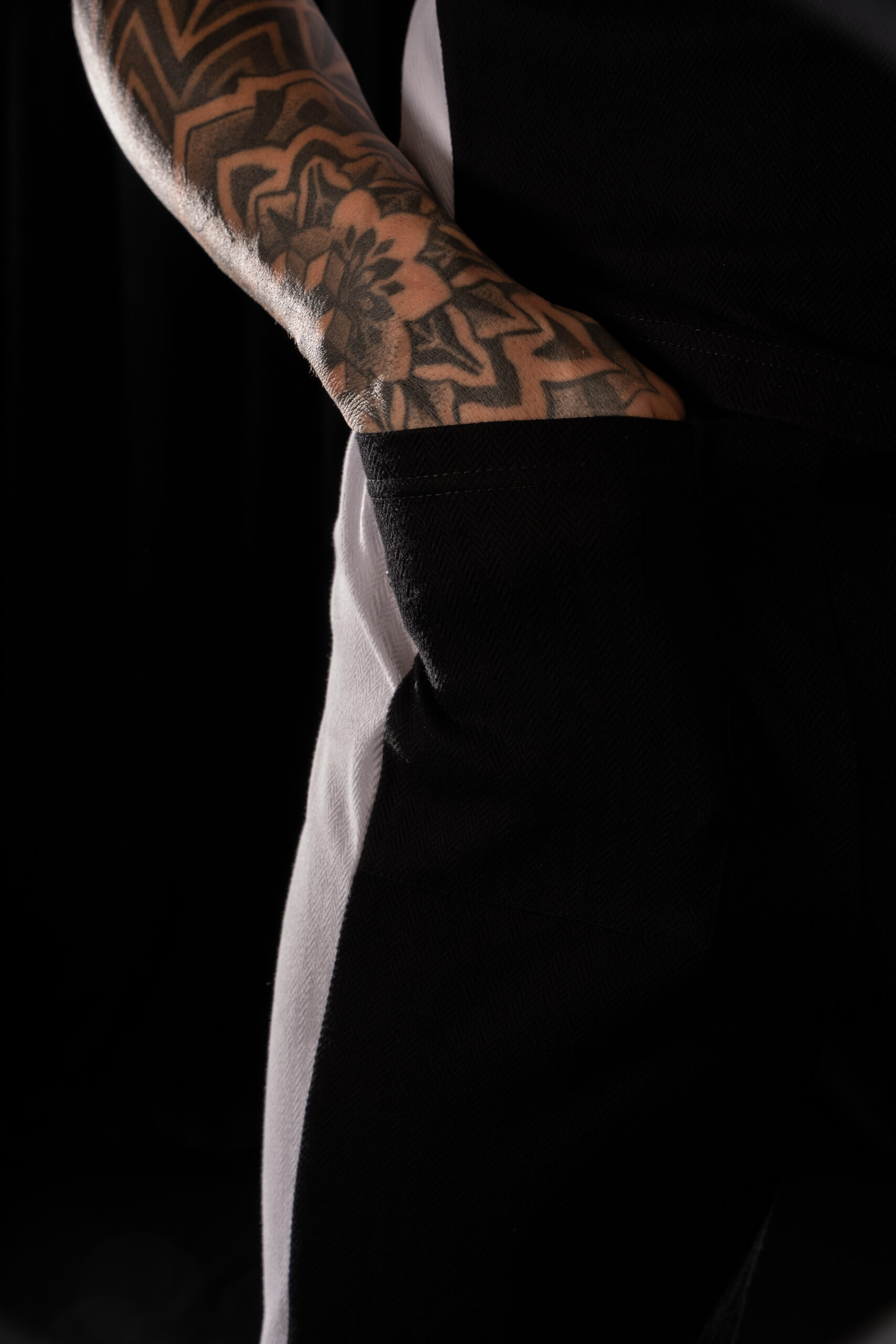 sharply finished at the bottom hems. Featuring a pocket placed in an unconventional location for a distinctive