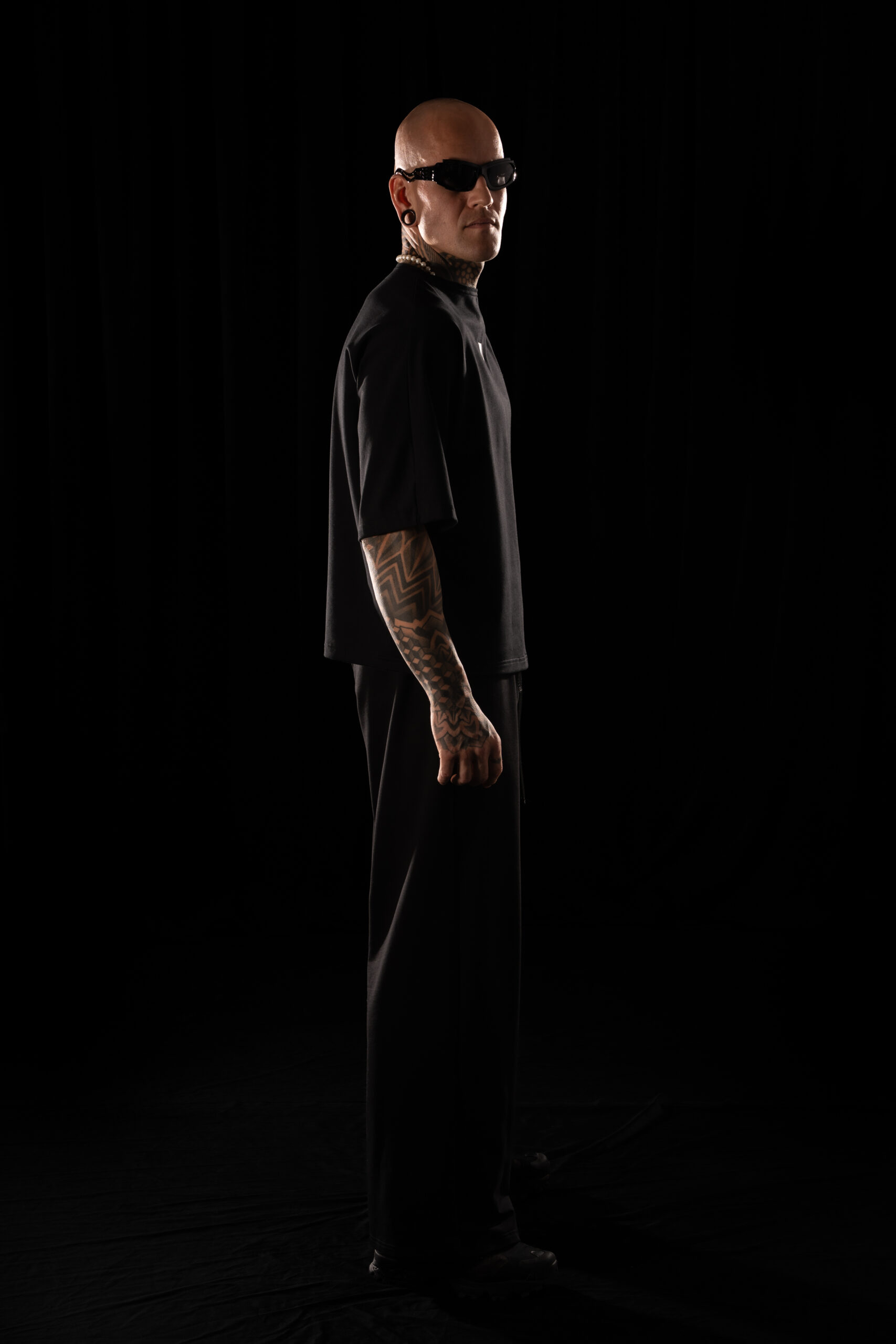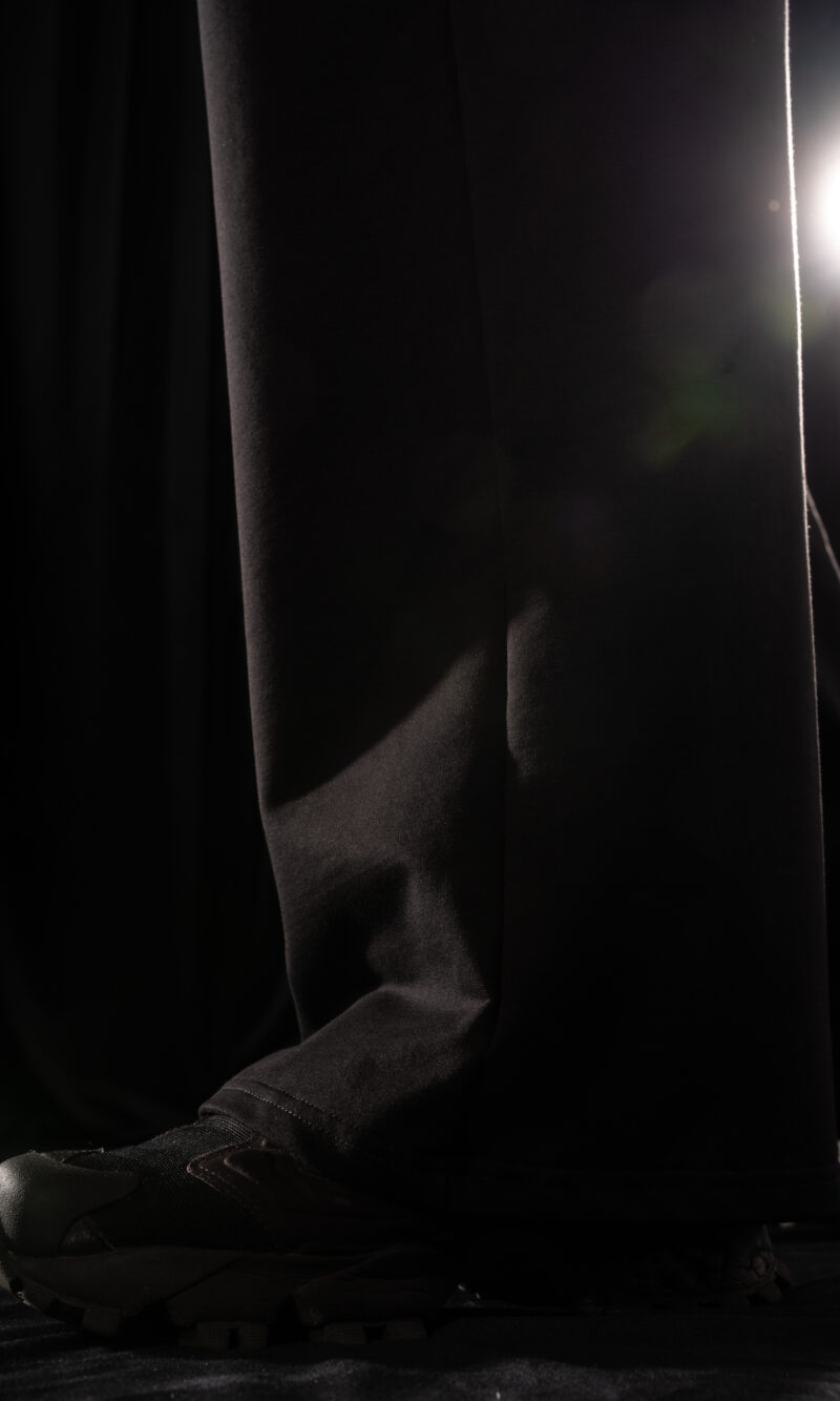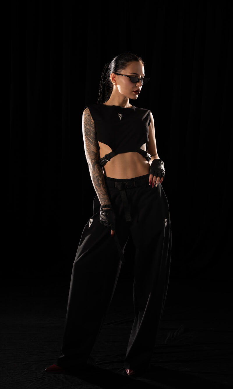 Long, wide-legged oversized Crystal Evo trousers with two concealed zip pockets in the side seams.