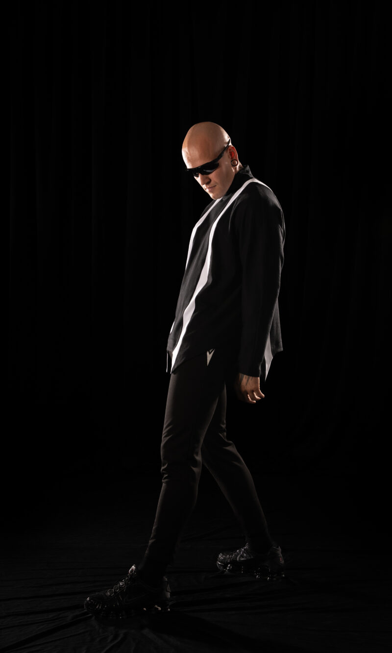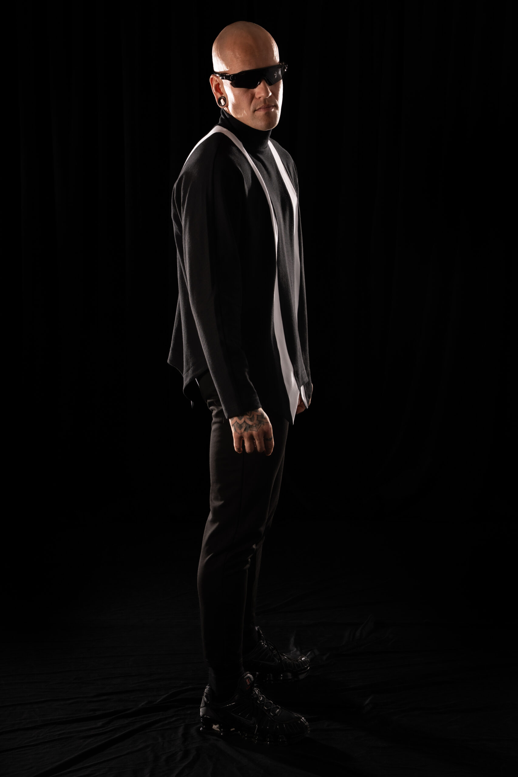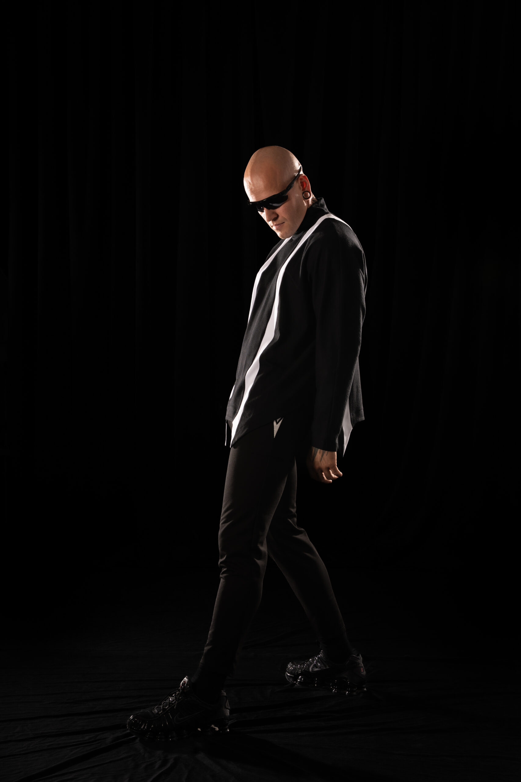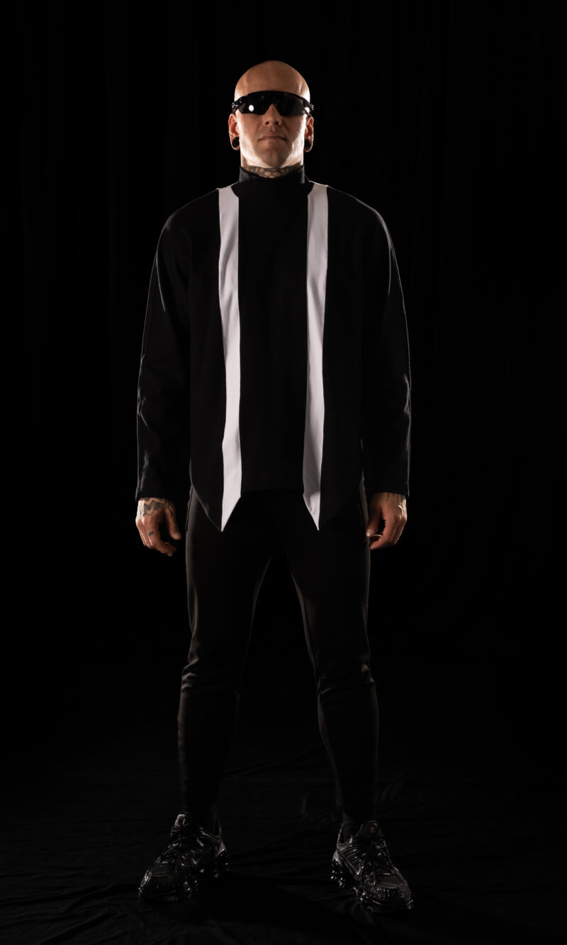 minimalist-technical aesthetic. Its signature detail is two parallel stripes running along the front and back,